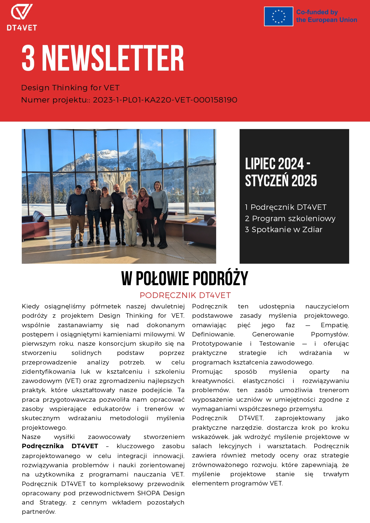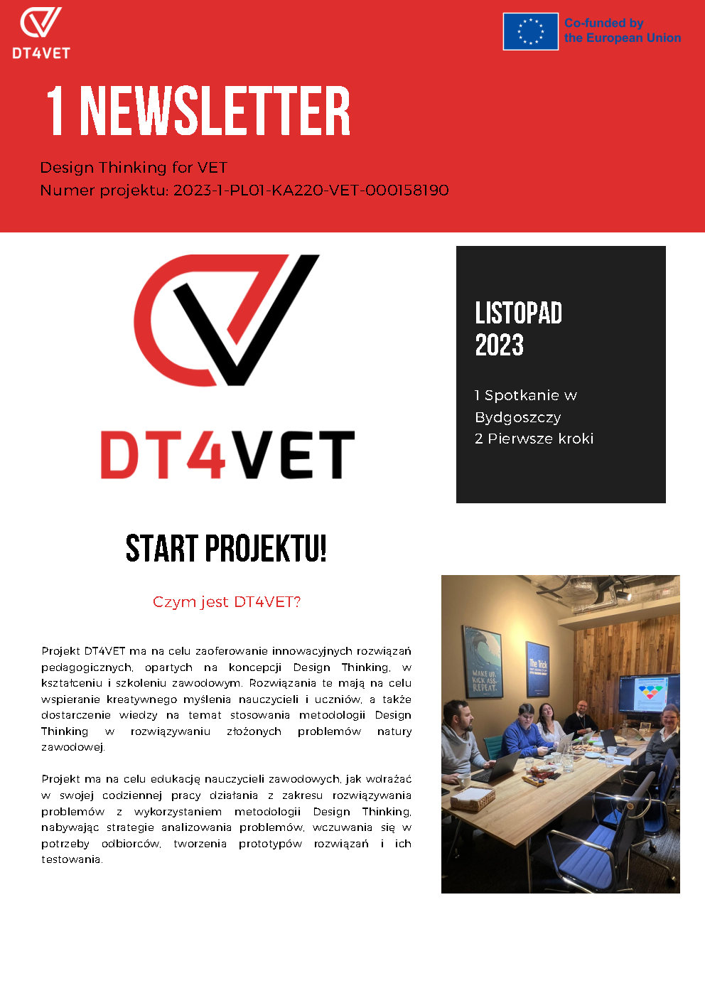 Spotkanie inauguracyjne odbyło się w dniach 22 i 23 listopada 2023 r. w Bydgoszczy, w Polsce, w siedzibie SHOPA, koordynatora projektu i eksperta w zakresie stosowania Design Thinking. W spotkaniu wzięło udział 7 przedstawicieli partnerów projektu, z czego 3 pochodziło ze SHOPA, 2 przedstawicieli z Europuente (Hiszpania), 1 przedstawiciel z Topcoach (Słowacja) i 1 przedstawiciel z Best Cybernetics (Grecja), którzy z powodu siły wyższej w ostatniej chwili uczestniczyli w spotkaniu online. Spotkanie trwało dwa dni, pierwszy dzień koncentrował się na administracji i zarządzaniu projektem, gdzie partnerzy mieli okazję lepiej poznać siebie nawzajem i swoje firmy. W tym pierwszym dniu zaprezentowano również plany dotyczące mechanizmów zarządzania jakością i monitorowania projektu, a także określono pierwsze kroki i zadania dotyczące opracowania podręcznika i platformy cyfrowej. Drugiego dnia SHOPA, jako ekspert Design Thinking, poprowadziła warsztaty dla pozostałych partnerów na temat Design Thinking, aby umożliwić im pogłębienie wiedzy i lepsze zrozumienie procesu metodologii Design Thinking, co zachęci ich do tworzenia materiałów wyższej jakości.