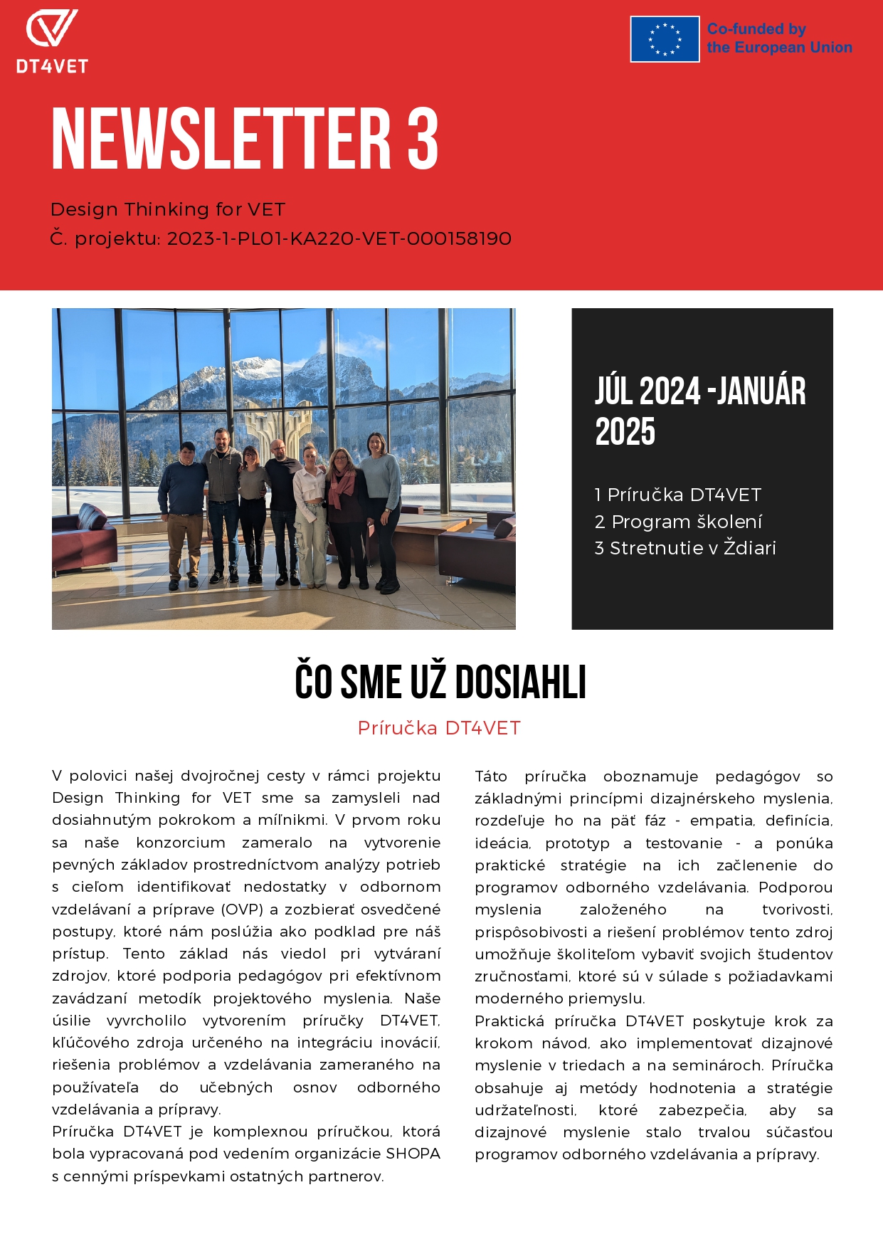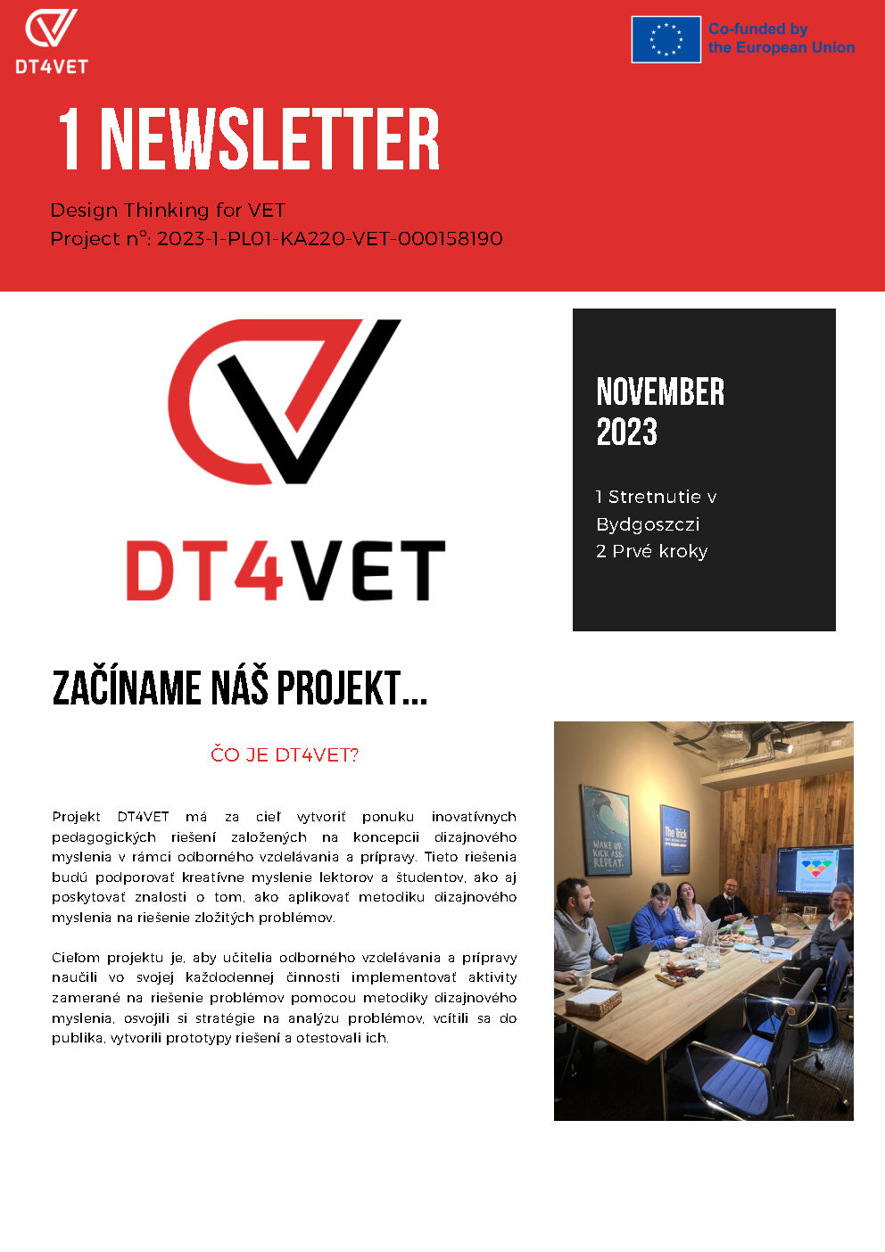 Úvodné stretnutie sa konalo 22. a 23. novembra 2023 v poľskom Bydgoszczi, kde sídli SHOPA, koordinátor projektu a odborník na používanie dizajnérskeho myslenia. Tohto stretnutia sa zúčastnilo 7 zástupcov partnerov projektu, z toho 3 zo SHOPA, 2 zástupcovia z Europuente (Španielsko), 1 zástupca Topcoach (Slovensko) a 1 zástupca Best Cybernetics (Grécko), ktorí z dôvodu last minute vyššej moci, zúčastnil sa stretnutia online. Stretnutie trvalo dva dni, prvý deň bol zameraný na administráciu a riadenie projektu, kde mali partneri možnosť lepšie spoznať seba navzájom a svoje spoločnosti. V tento prvý deň boli predstavené aj plány na riadenie kvality a mechanizmy monitorovania projektu, ako aj zadefinované prvé kroky a úlohy pre vypracovanie manuálu a digitálnej platformy. Počas druhého dňa SHOPA ako expert na dizajnové myslenie usporiadala pre ostatných partnerov workshop o dizajnovom myslení, aby si partneri mohli prehĺbiť a lepšie porozumieť procesu metodológie dizajnového myslenia, čo podporí tvorbu kvalitnejších materiálov.